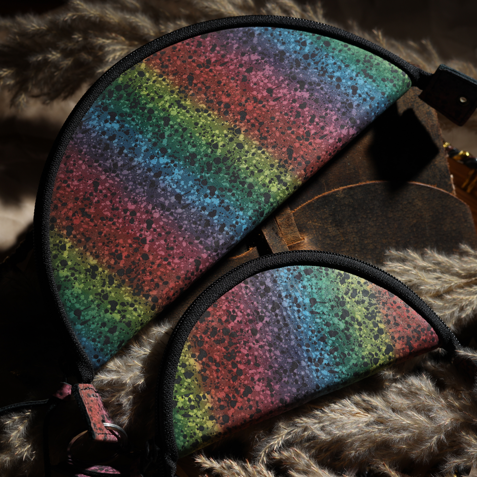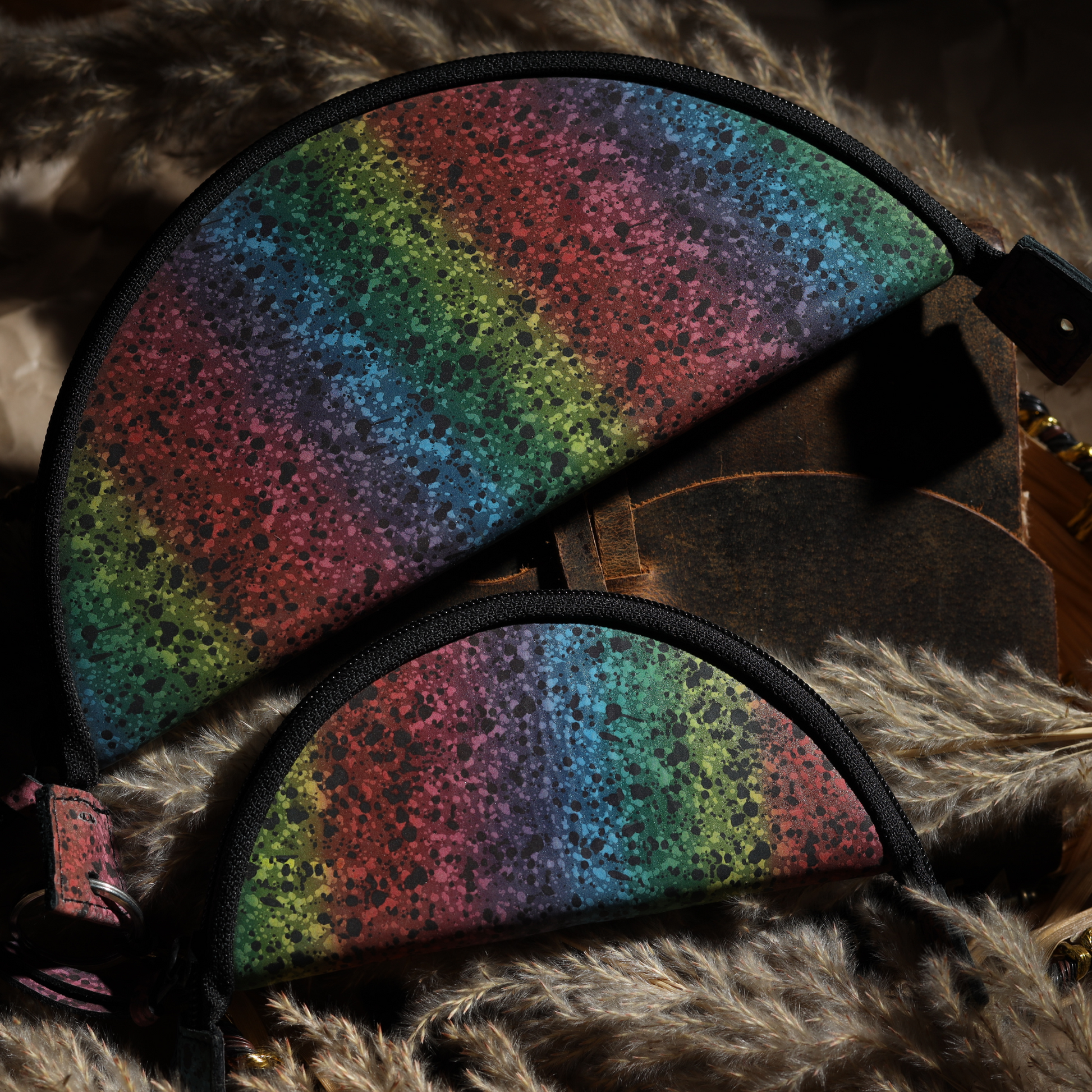 The outer surface is finished with a reflective rainbow-speckled foil on black crust leather, flash-reactive under phone light or camera, bursting with nightlife energy.