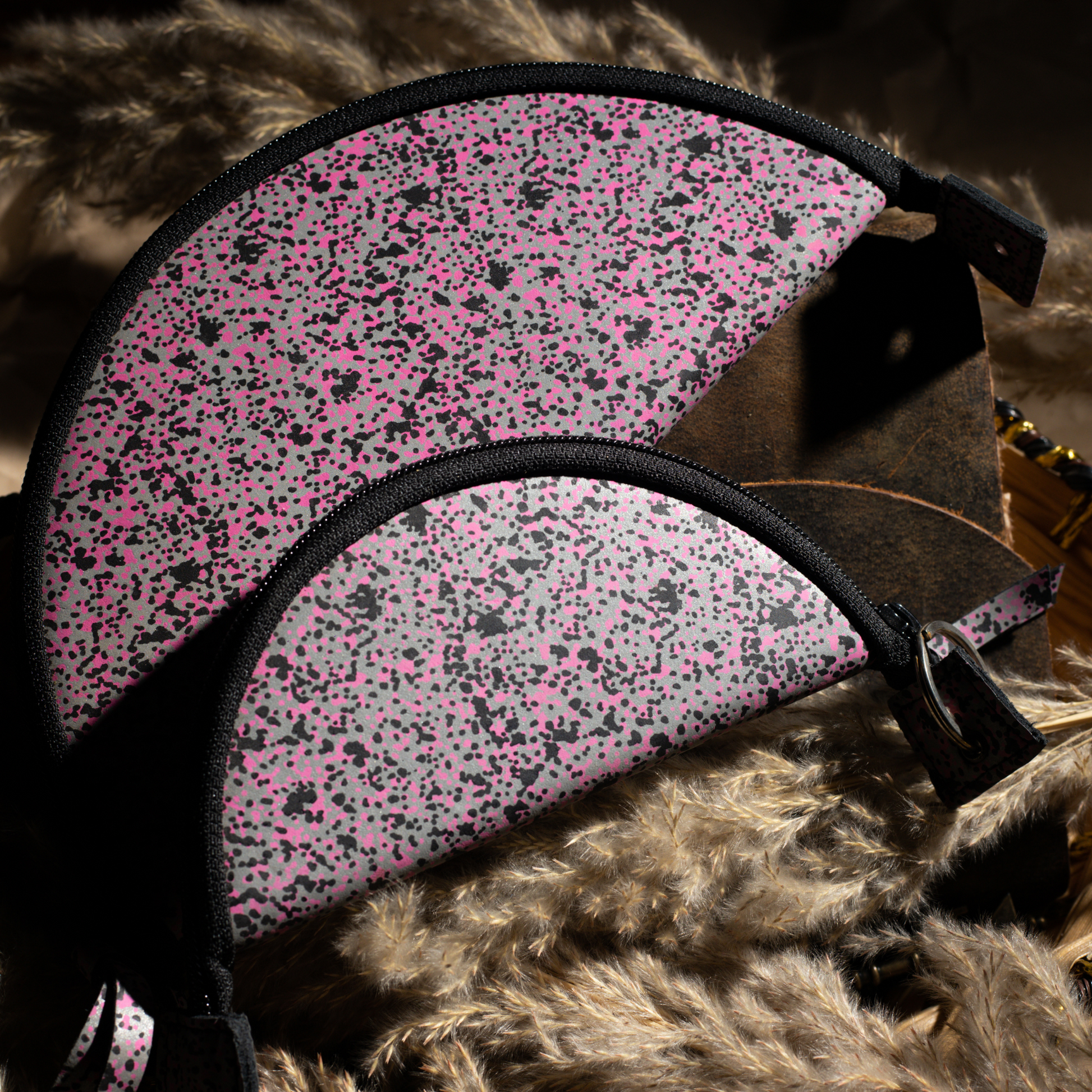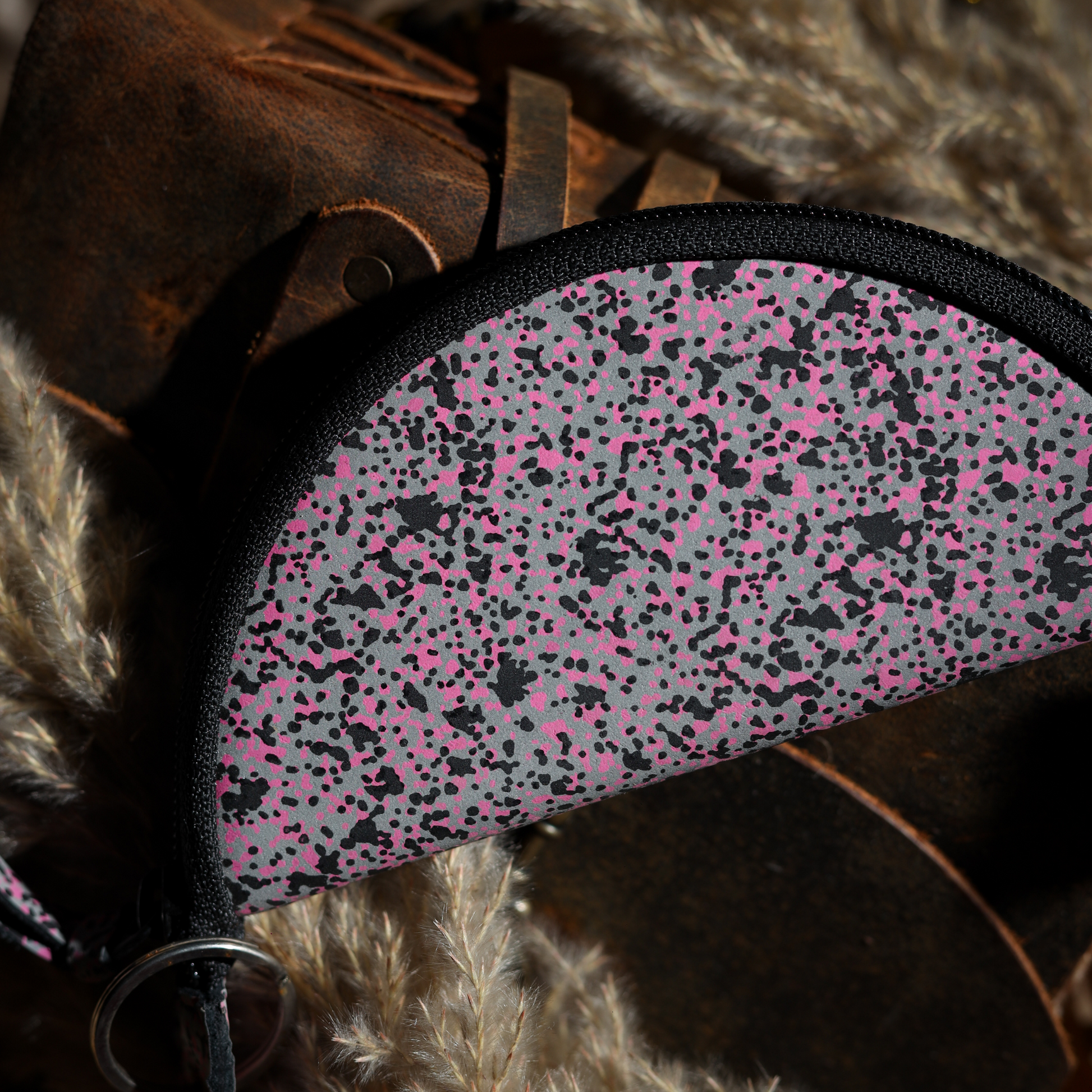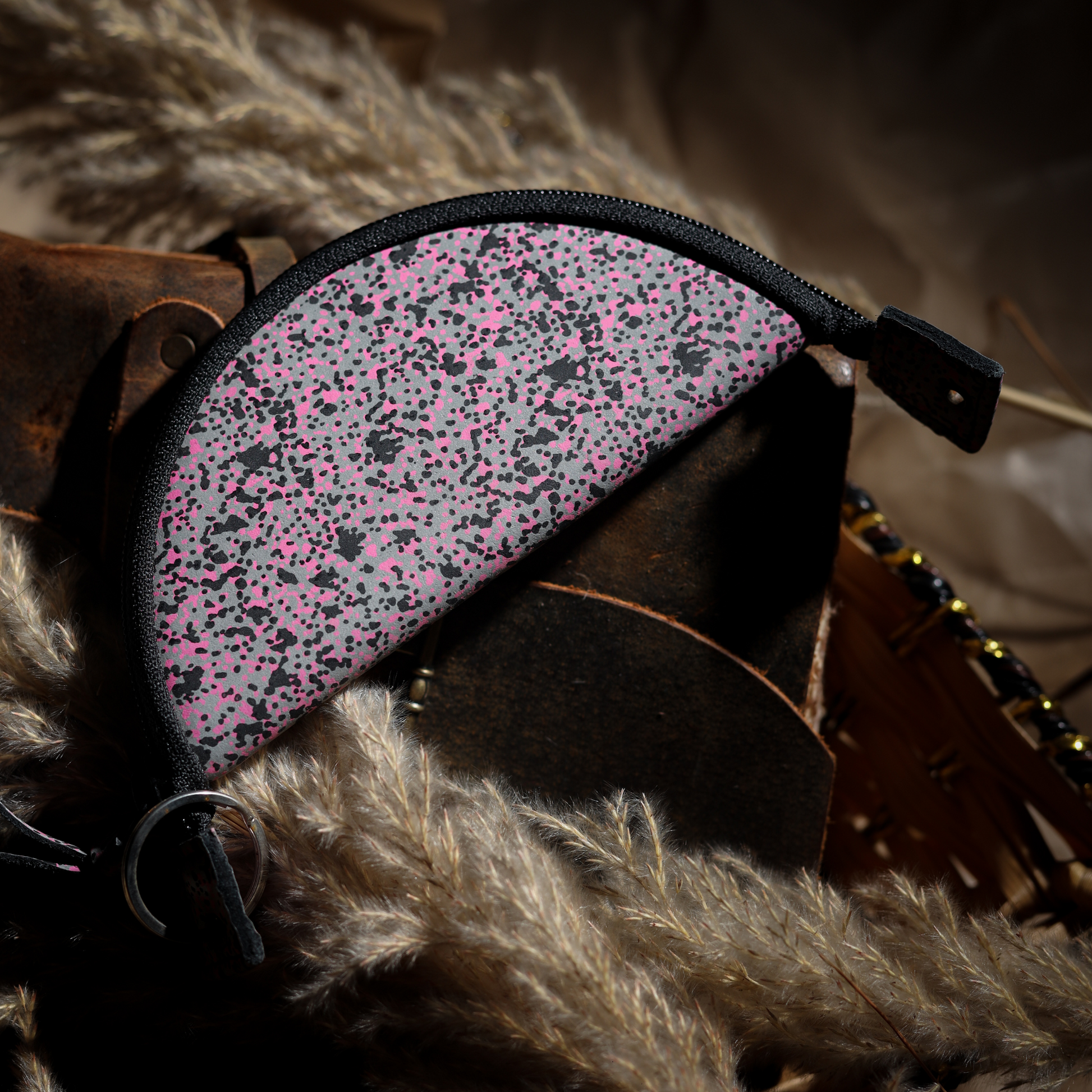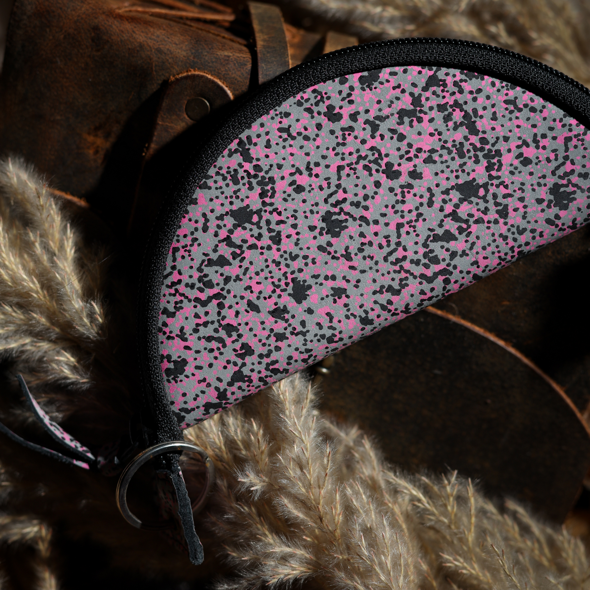 Material: Inner – Calf DD leather (1.3mm, lab-tested); Outer – Reflective pink-speckled foil on black crust (1.3mm)