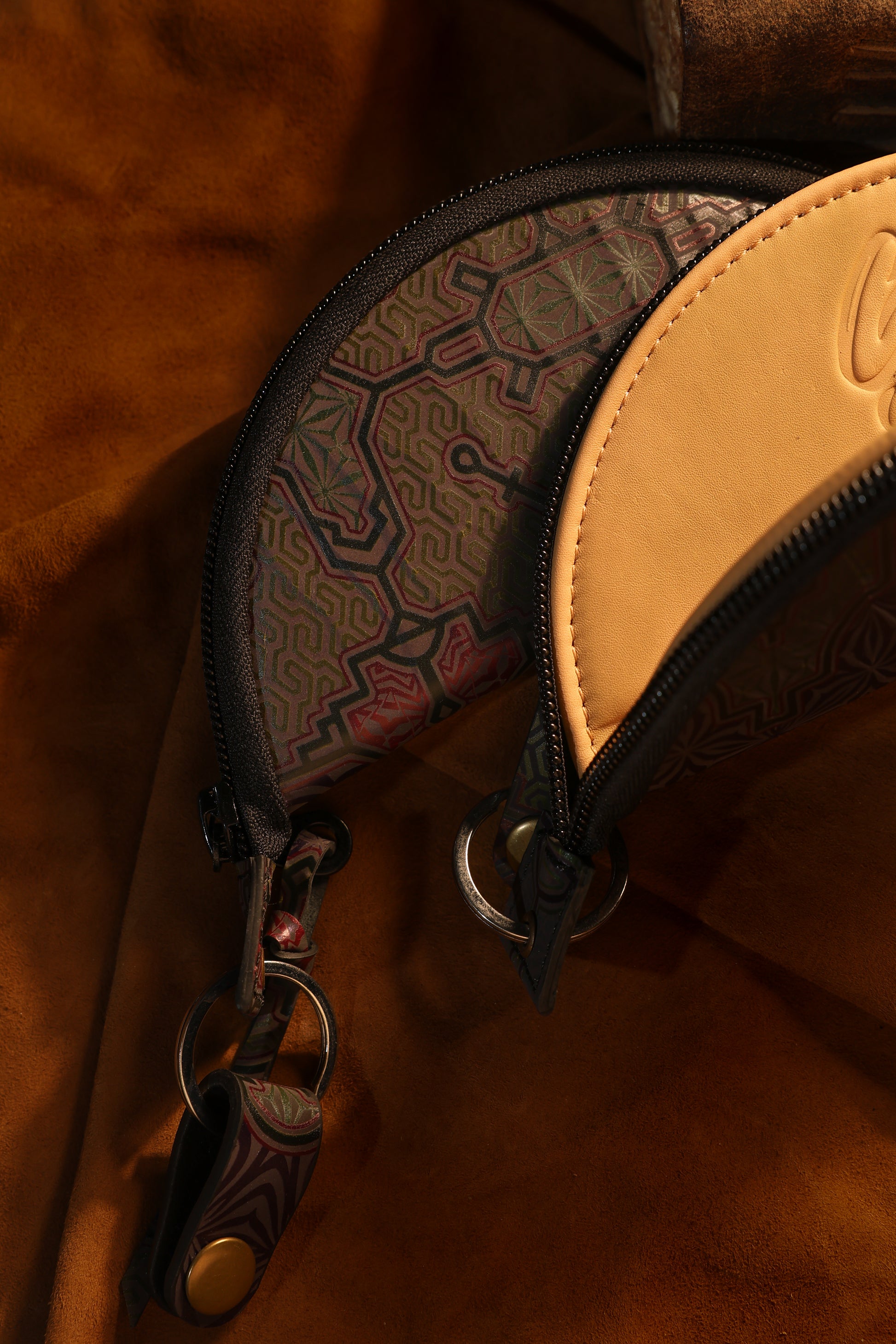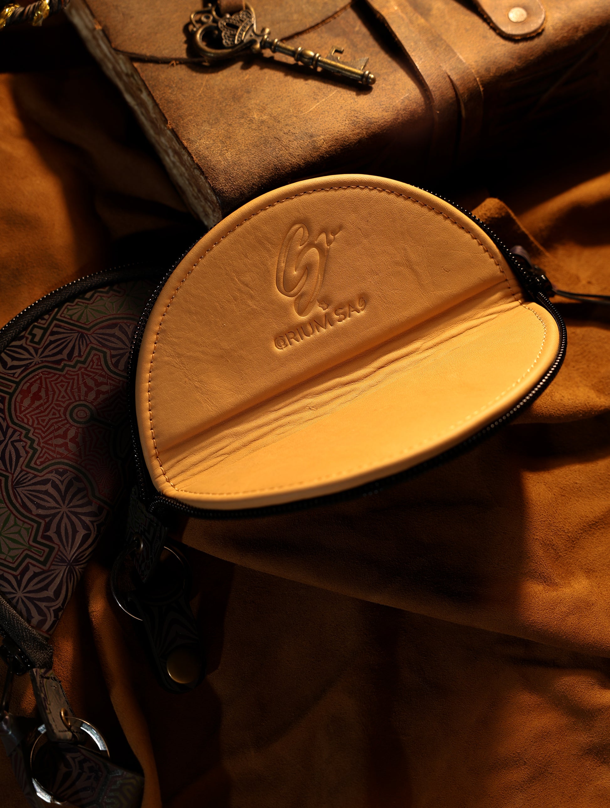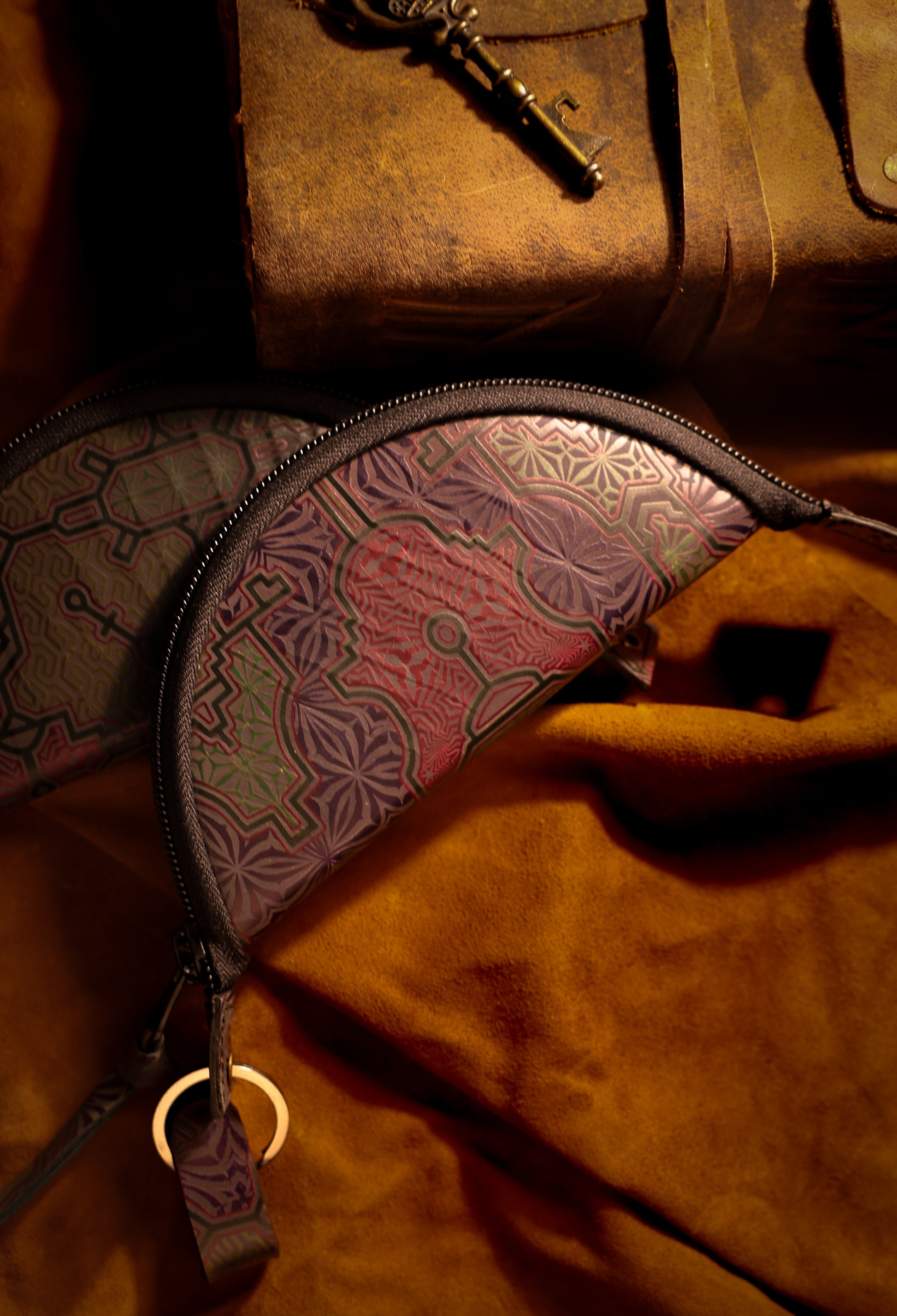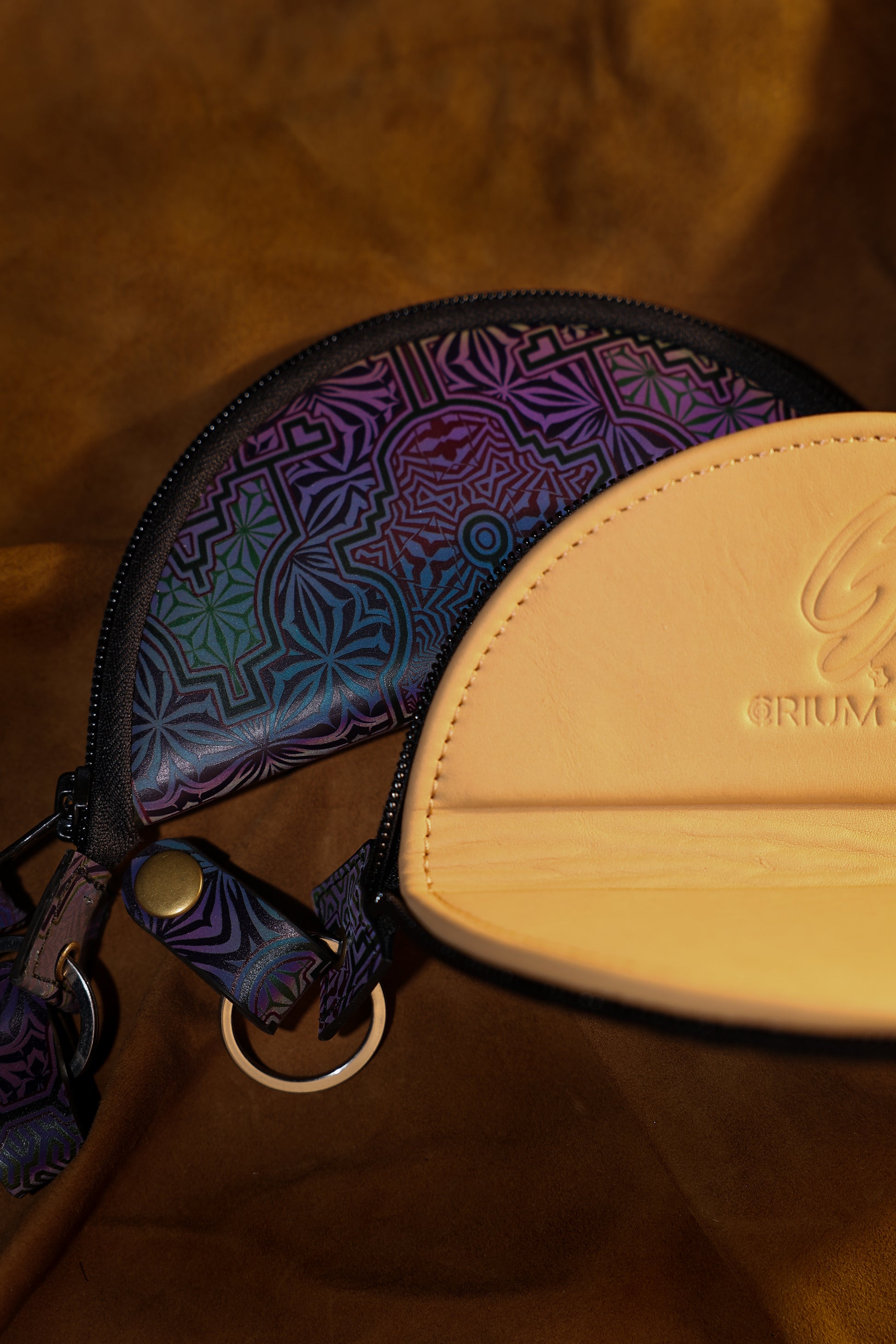 With time and use, the leather softens and darkens, forming a personal patina unique to its keeper. A detachable key ring and leather puller add tactile control and everyday utility—grounding sacred geometry inside a functional, daily artifact.