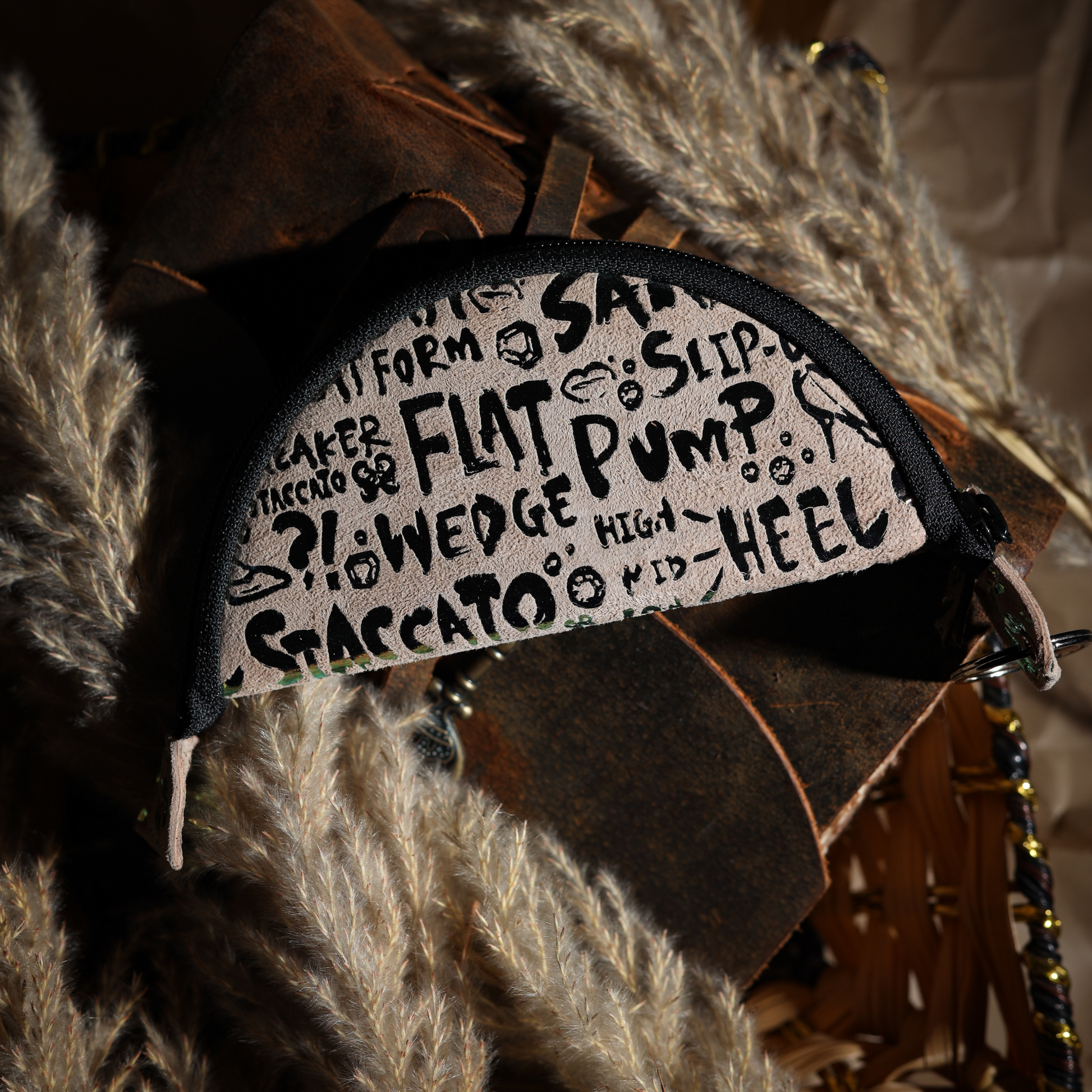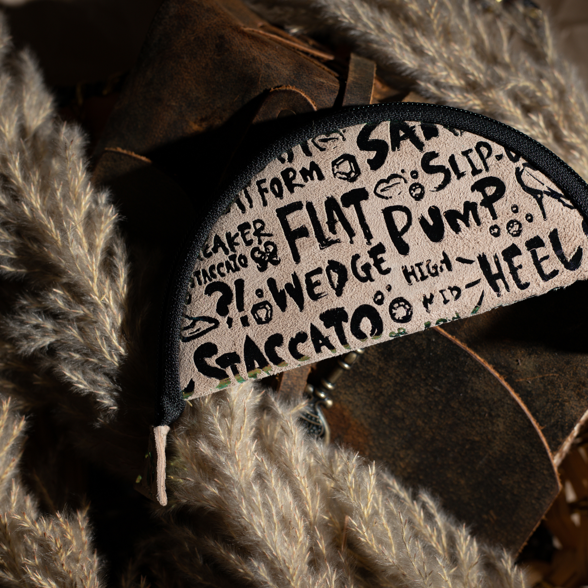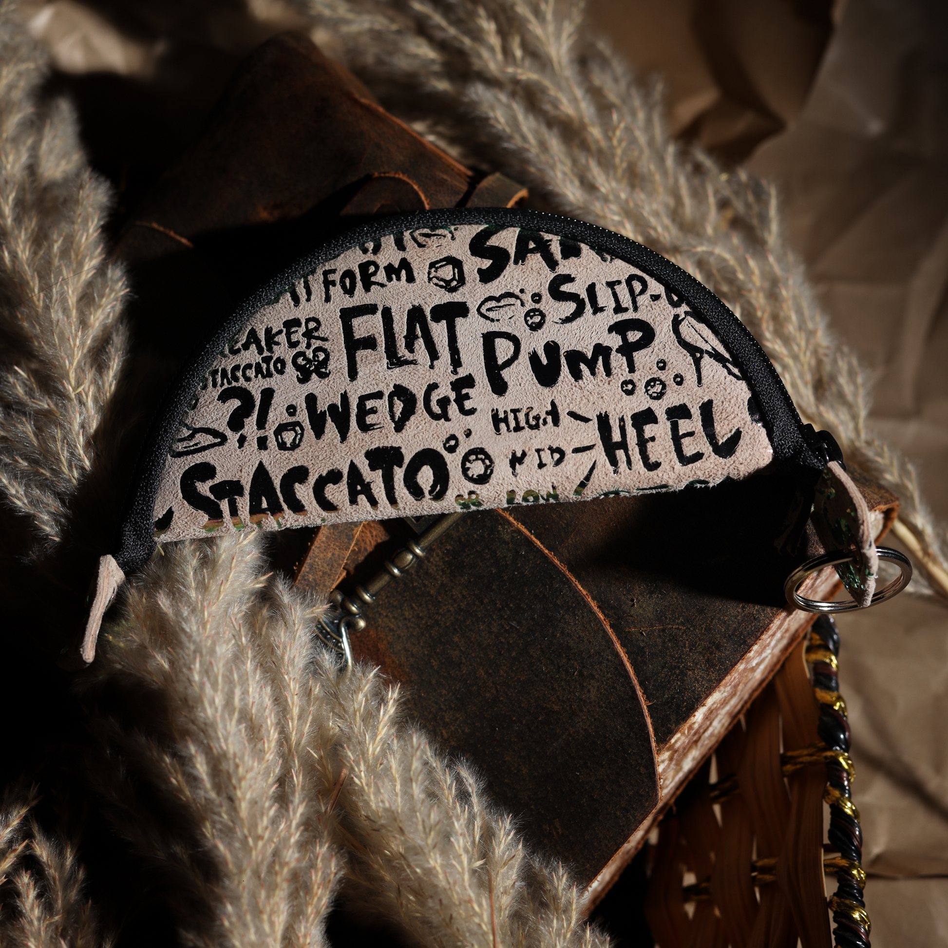 The outer surface is scarred with raw stencil typography, a graffiti-inspired foil finish that transforms leather into manifesto.