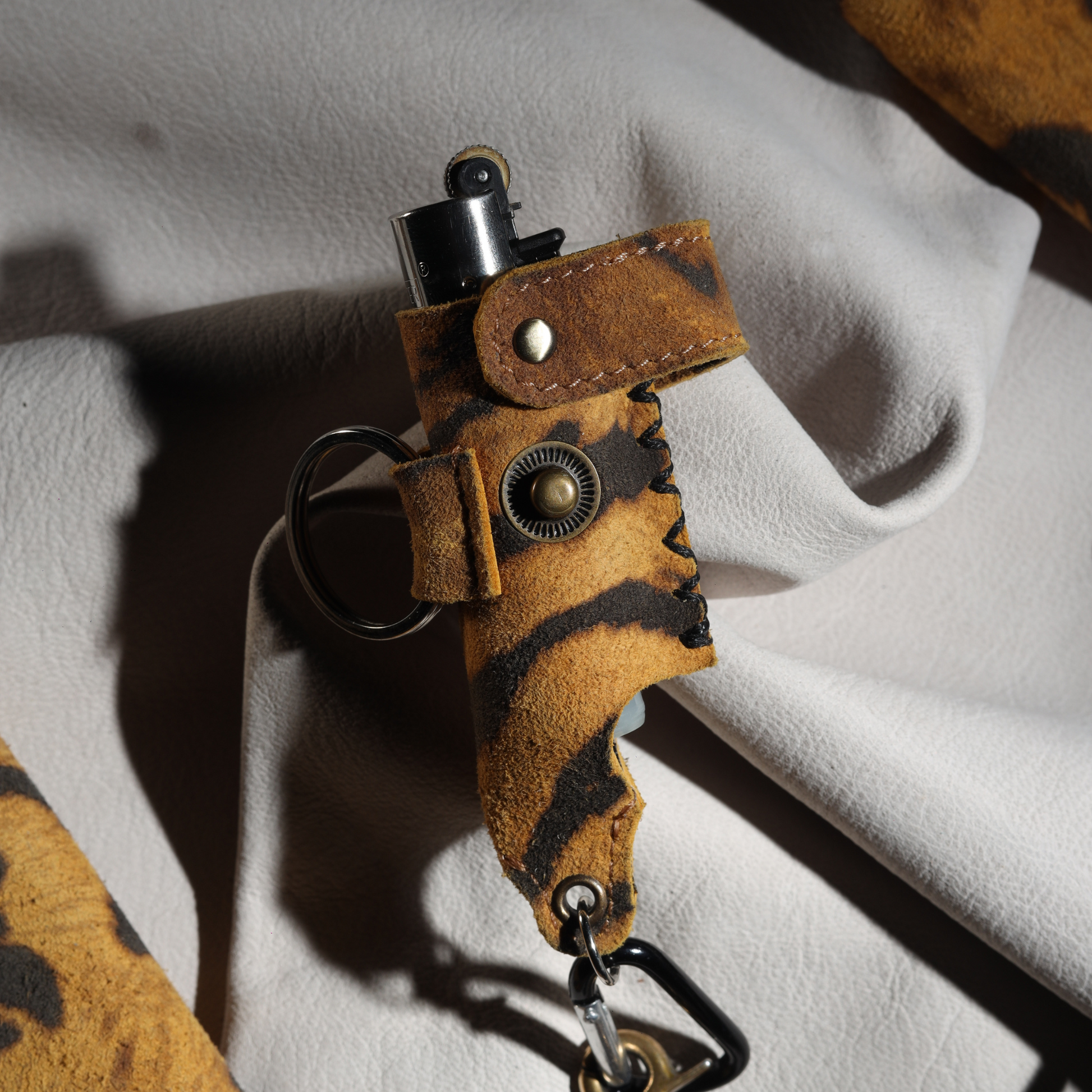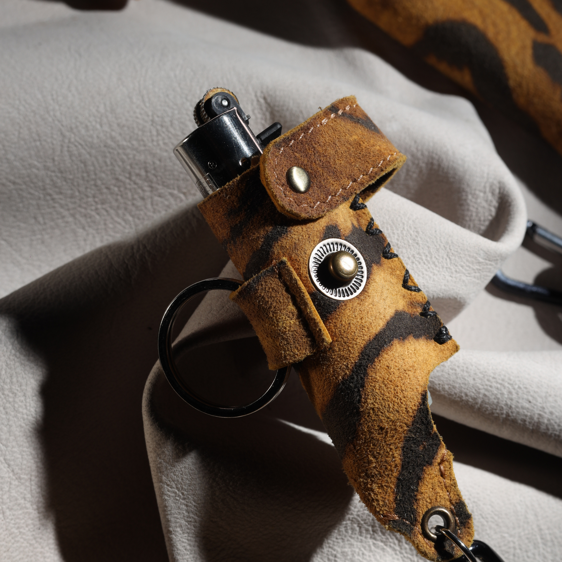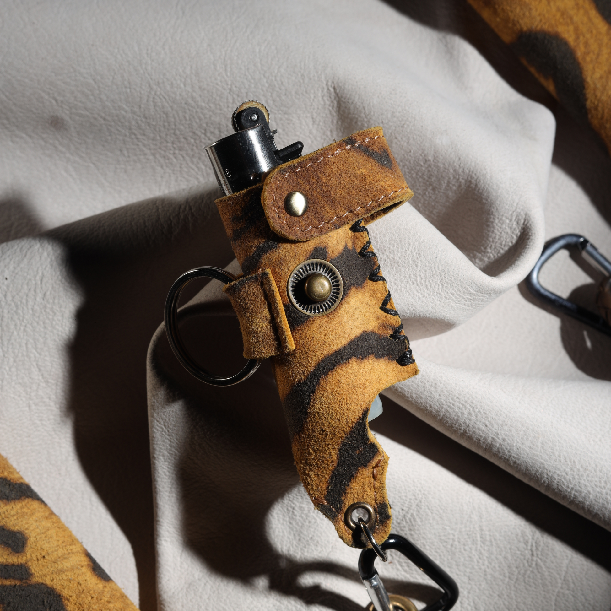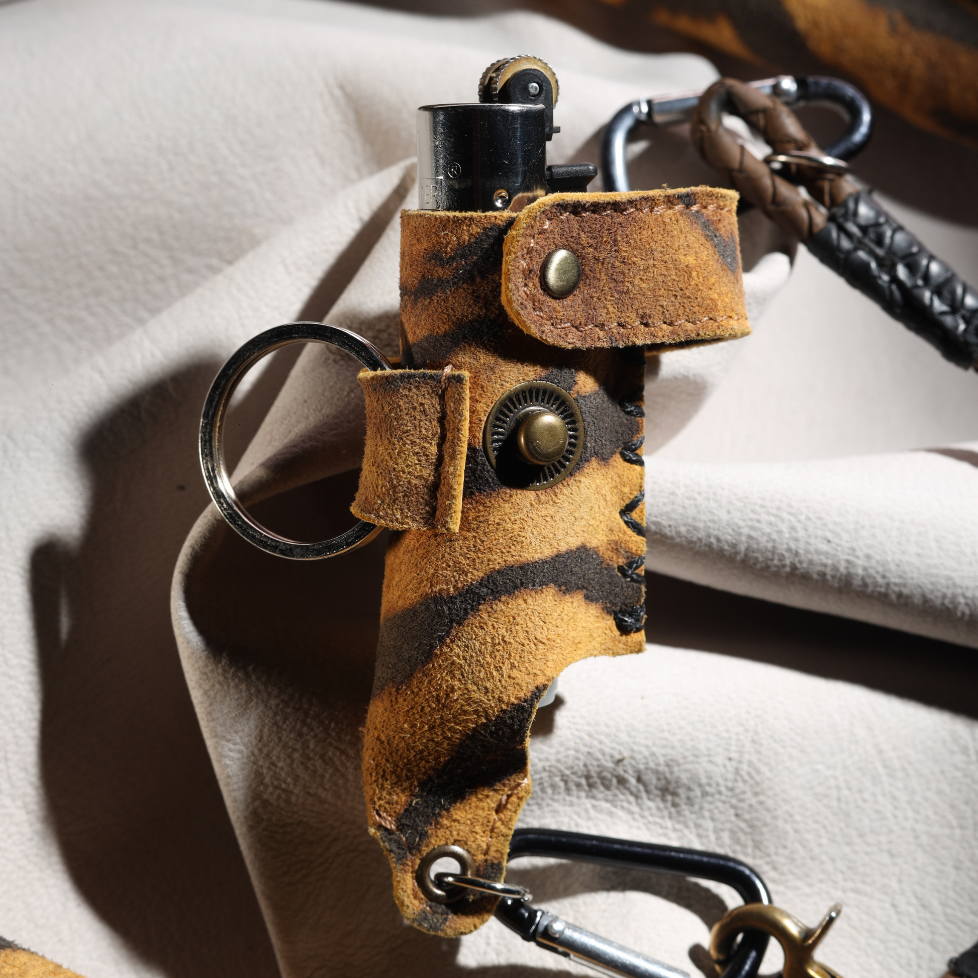 The BENGAL STRIPE lighter holder is crafted from genuine goat suede, brushed with bold tiger-stripe patterns that echo the raw ferocity and primal elegance of the wild.