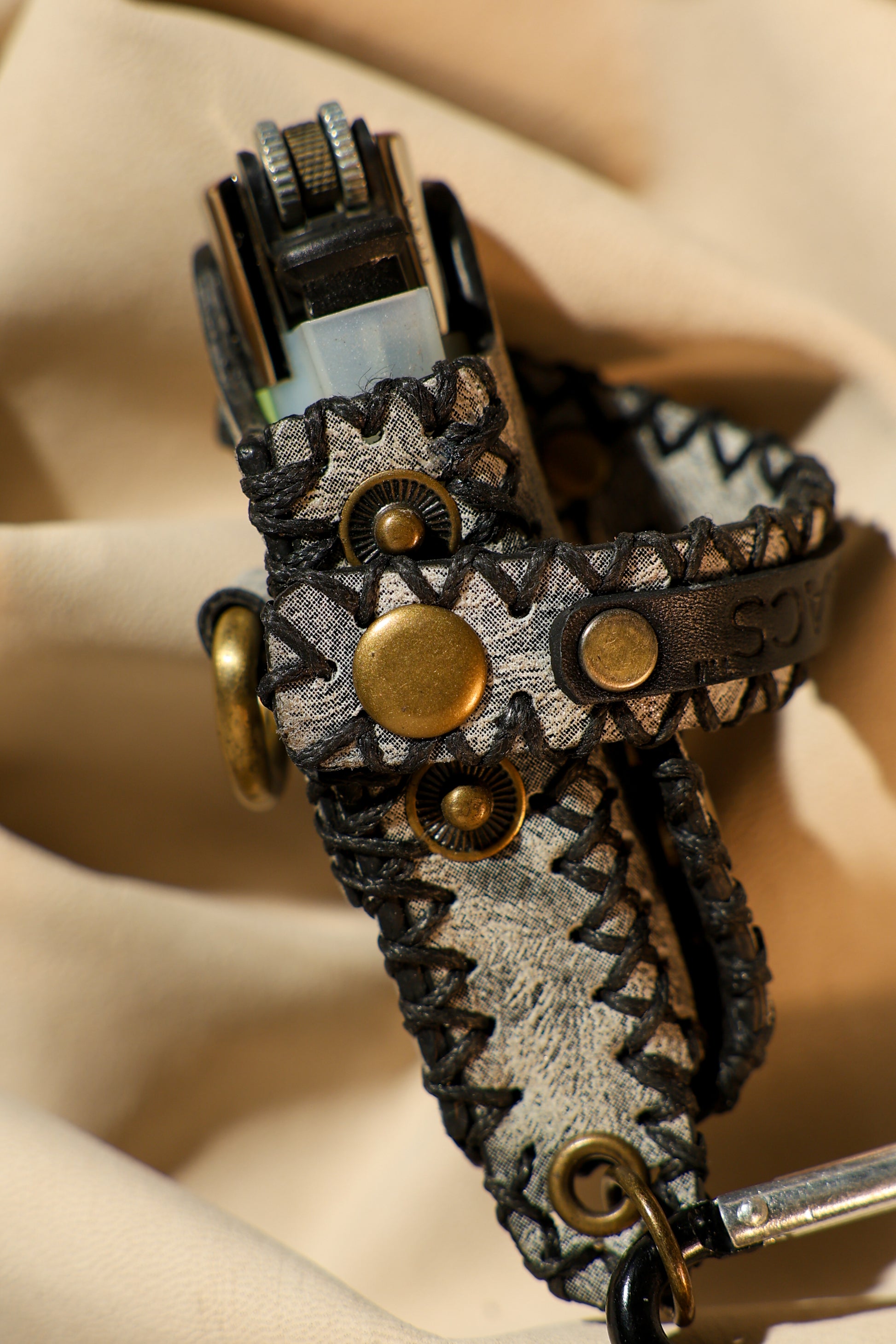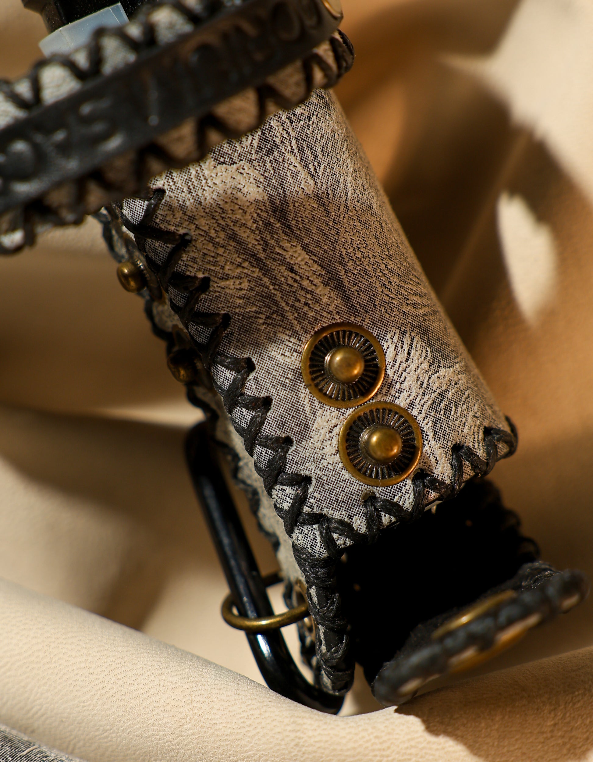 Hardware: Brass rivets, snap buttons, dual rings, rear D-ring, and carabiner