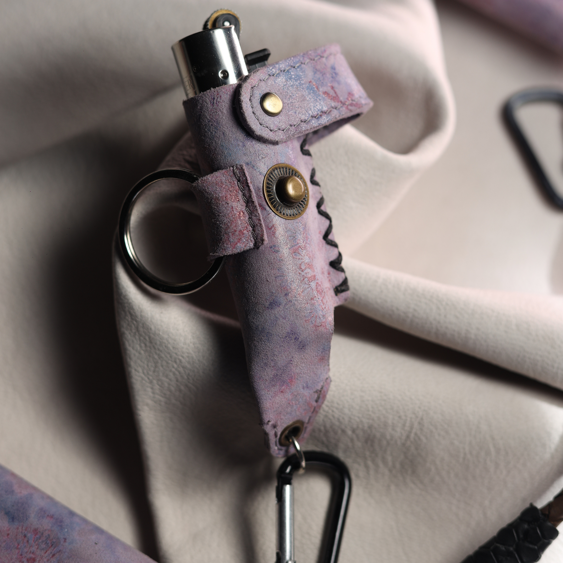 The LILAC HAZE lighter holder is crafted from genuine goat suede, washed in soft hues of violet and blush that evoke a drifting haze of dreamlike abstraction.