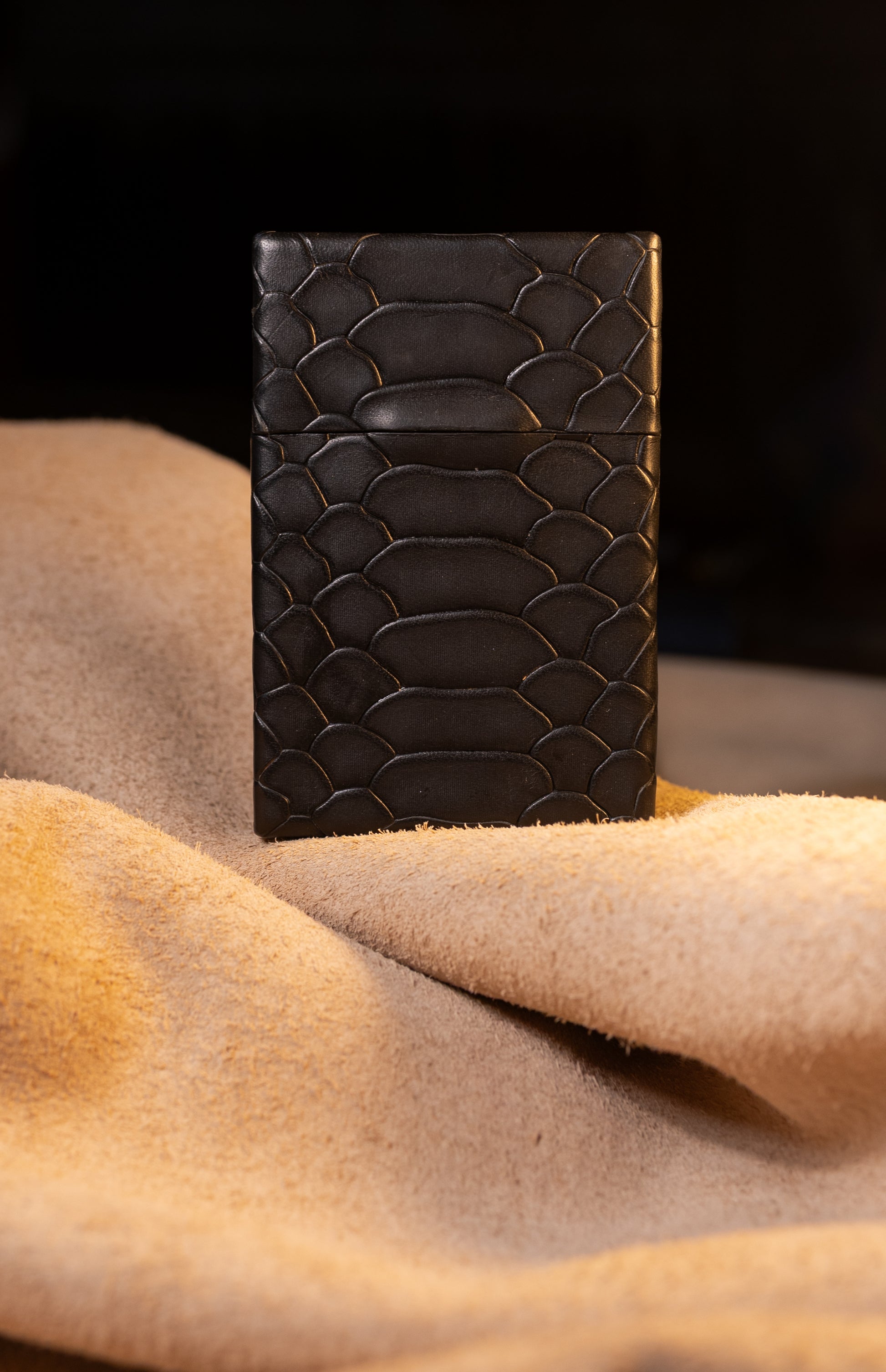 The SMOK-PACK / BLACK-CROC is a limited-edition cigarette case forged in deep black leather and pressed with a reptilian croc-scale texture—sleek, stealth, and brutally elegant.